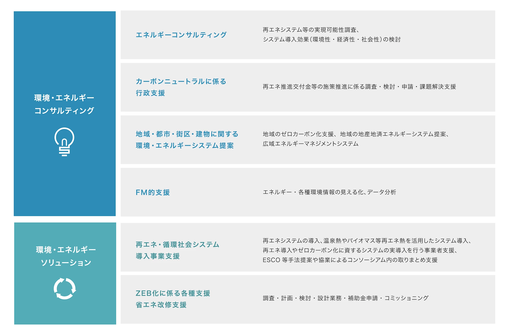 弊社は、50年の長きに渡り建築設備設計事務所として培ってきたノウハウを重ね合わせ、お客様が抱える環境・エネルギーに関する課題に対し、調査・計画・検討から、設計、補助金申請、コミッショニングに至るまで、トータルソリューションをご提供いたします。